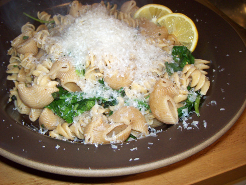 Cook pasta to al dente in salted water. When pasta almost done done, melt butter in a skillet. Swirl the butter in the pan as it foams. (At this point, remove pasta from the heat and drain well in a colander.) When butter begins to brown, toss in pasta and mix to coat with butter. Salt and pepper to taste. Add greens and sage and cook until slightly wilted, about 1 to 2 minutes. Plate and serve immediately with grated parmesan and lemon wedges on the side. The lemon really makes this dish!