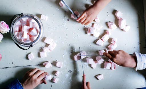 Dust tops of marshmallow with remaining ¼ cup powdered sugar. Turn out of pan and cut into 1” pieces; dust with more powdered sugar.