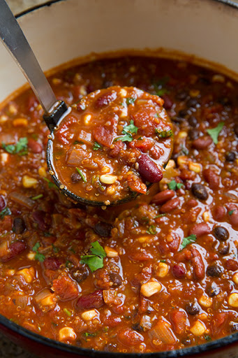 Add in all beans, cilantro and lime and cook until heated through. Serve warm with optional toppings and sides (cheddar, sour cream, diced avocados, saltine crackers or tortilla chips).