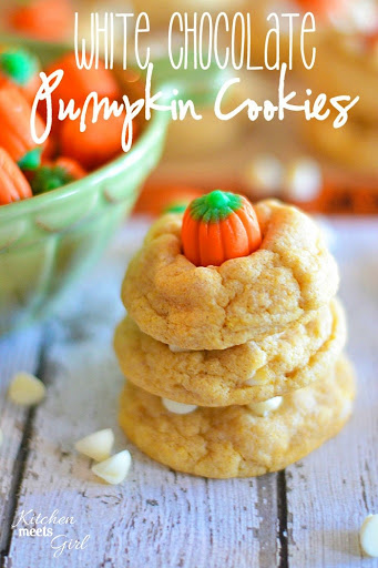 3.Using a cookie scoop, drop dough by tablespoonfuls onto prepared cookie sheets 2 inches apart. Using the remaining 1/4 cup white chips, press a few chips onto the tops of each cookie. If you're using the marshmallow creme pumpkins, don't worry about adding any extra chips to the top.
