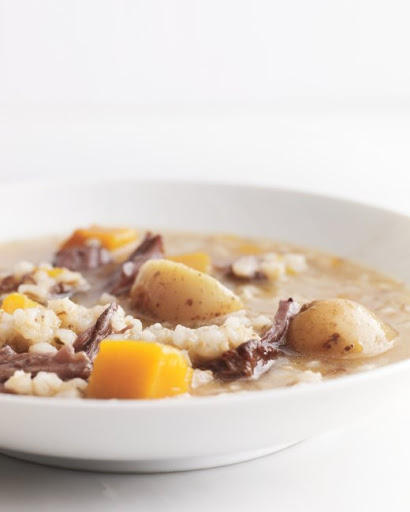 Add potatoes, squash, barley, 2 cups water, and remaining 2 cups broth to slow cooker, cover, and cook on high until meat is very tender, 4 hours (or 8 hours on low). Using two forks, shred beef. Season to taste with salt and pepper.