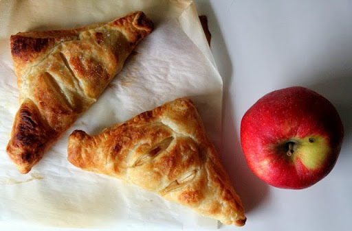 5. Brush the edges of each square with a little bit of water. Place about 1/3 cup of the apple mixture onto half of each square and fold the pastry diagonally over the apples. Seal the turnovers by pressing the edges with a fork.