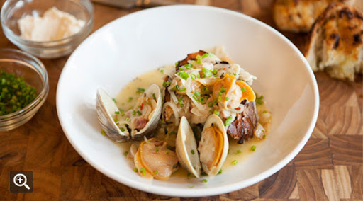 4. Place the toasted bread on a plate and rub each slice with the halved garlic, then spread with some of the mayonnaise. To each plate, add 1 slice of bread, and top with some clams and some of the wine sauce. Sprinkle with the chives and serve with a squeeze of lemon juice and a pinch of salt, if needed.