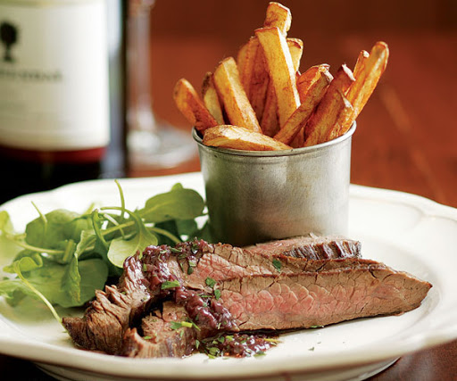 With a sharp knife, slice the steak thinly across the grain on the diagonal, drizzle with the sauce, and sprinkle with remaining tarragon.