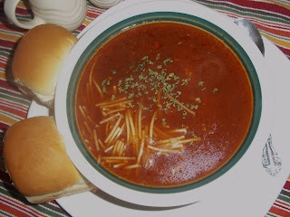 Do you continue to go back to a certain restaurant for one dish, and one dish alone. It's not to say the other parts of the menu aren't just as tasty, but this one thing makes you drool at the mention of it's name, you crave it weekly, and you would drive hours to have it? For us, that would be the Fideo Soup at one of our favorite Mexican restaurants here in Fort Wayne, El Azteca. This is a family owned restaurant (I love that. Chains are okay, but I like to support local people) that serves some of the best traditional Mexican food in the city. Personally I love their chicken enchiladas. Oh, and the margaritas :) But the one thing that all 3 of love, and I mean w/ a capital "L" is that soup. Fideo Soup is best described at Mexican Noodle Soup. Yep, it's that basic. From the first time Adam and I tried it we wanted more and more. We've been known to go in there and eat the free chips and salsa and 2 big bowls of soup for a meal! And each time we ate it we would try to guess what was in it. Then one night we were taking a guest there, whom has food allergies, so we had to inquire as to what the ingredients were. They were very gracious in telling us the list; but of course no specific amounts. I have to say, upon learning what exactly made up this grand soup, I was pretty proud of us b/c we had figured most of it out. So I went searching for some info on just how much of everything to include, and after finding several ideas and different versions, I came up w/ what I was the closest thing we could get w/o getting in the car. I love when a good plan works out, our tongues don't lead us astray and we can have a favorite any night of the week!