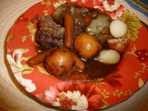 - 4 pound beef chuck eye roast - pulled apart, fat trimmed and tied back together