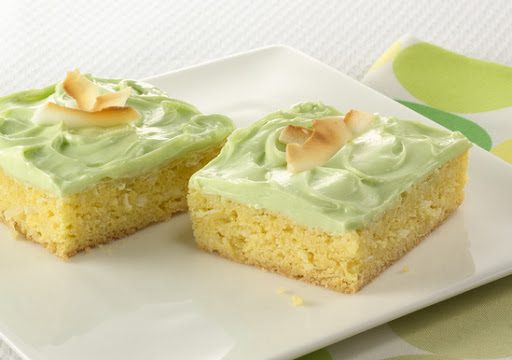 7. Frost bars with Key Lime frosting you just created. Cut into bars then sprinkle toasted coconut on top of each bar.