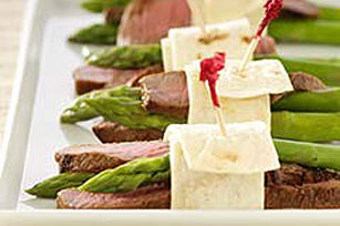 CUT steak into thin strips. Place 1 to 2 steak strips and about 2 asparagus spears on each tortilla strip; roll up. Secure with frilled toothpicks or red bell pepper ties, if desired. Serve warm.
