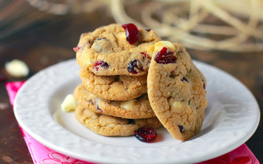 In the bowl of a stand mixer (or in a large bowl with an electric mixer) combine sugars and butter. Beat ingredients until they are light and fluffy, about 3-5 minutes. Leave mixer on and add eggs, vanilla, cinnamon, ginger, salt and slowly sprinkle baking soda in. Once ingredients are well combined, turn mixer to low and add flour. Mix until just combined. Add dried cranberries and white chocolate chips. Mix to combine (or fold in if you prefer).