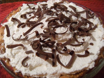 6. Shave the Hershey bar over the top of the pie with a vegetable peeler, making long curls.