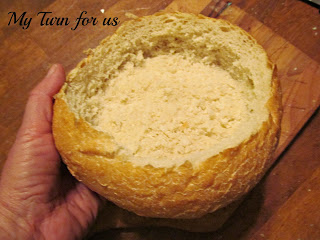 Pour your hot soup or creamy dip into the bread bowl just before serving.
