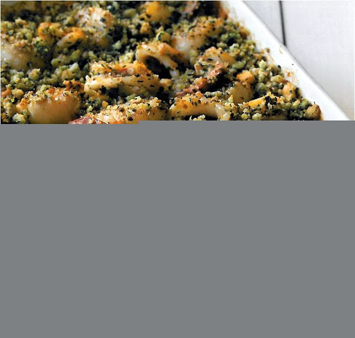 2. Heat 1 tbsp (15ml) olive oil in a skillet over medium heat. add chorizon and saute for 1 min. Add onions and garlic and saute for 3 mins or until soft. Add squid and saute for 1 min. Add tomatoes, parsley, thyme and bay leaf and simmer gently for about 10 mins or until flavours are combined. Add beans and stock and cook another 10 mins or until beans are flavourful. Season well with salt and pepper. Transfer bean mixture into a 9 x 13 inch oven-proof baking dish.