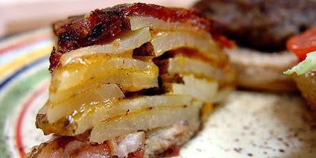 2. Line a 6-inch non-stick fry pan with bacon slices, arranging them in a radial pattern and starting with one end of bacon in the centre of the pan and the other end draped over the edge. When the entire surface of the pan has been covered, sprinkle with pepper and add a layer of sliced potatoes to cover the bottom. Sprinkle with grated cheese and pepper and repeat layers until they are slightly above the top of the pan.