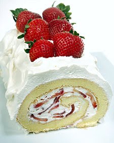 7.Unroll cake. Evenly spread strawberry whipped-cream mixture over surface of the cake and re-roll. Transfer cake to a serving plate and evenly spread top and sides of cake with reserved whipped cream. Cut reserved whole strawberries in half lengthwise and place on top of cake for garnish.