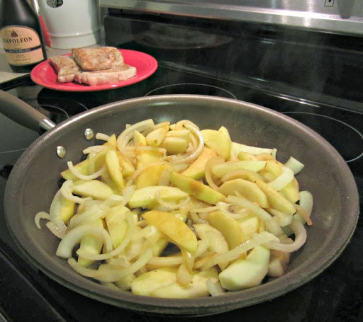 Add apples and onions to hot pan. Stir around and cook for about 5 minutes, or until they both begin to soften. Add garlic and cook another minute.