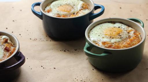 Coddled Egg with Crab, Bacon and Leeks