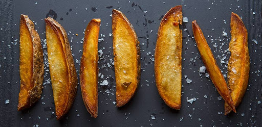 Let the potatoes cool and then store them in the fridge for up to four days. While they're still cold, cut the potatoes into thin wedges. Put enough canola oil in a 4-quart saucepan so it's about two inches deep. Heat the oil to 350 and drop in a small handful of potato wedges at a time, , letting them cook until golden brown. Toss with sea salt and serve.