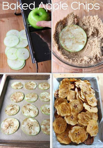Using a mandoline, slice the apples as thinly as you can. Mix the sugar and the cinnamon in a shallow bowl and dip the apple slices lightly in the mixture, just lightly coating them. Lay the slices on the baking sheets, about 12 slices per sheet. Bake for 1 hour. Remove one pan at a time and flip the apple slices over with tongs. When you return pans to oven, also rotate them - put the one that was on the top rack on the bottom. Bake for one more hour. Remove pans from oven. Apple slices will start to harden up pretty quickly. Remove with tongs.