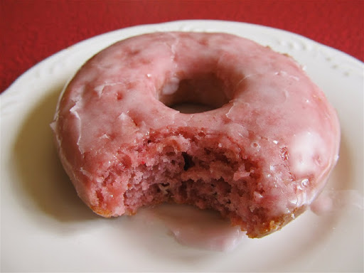 Stir until well combined. Stir in strawberry mixture, starting with 1/2 of it and adding more only if needed. Batter should be wet, but not runny. Put dough into a pastry bag or plastic bag and snip approx 1-inch off end. Pipe batter into each well, reserving extra batter. Bake for 7-9 minutes until doughnuts spring back when touched. Let cool five minutes and turn onto a cooling rack to cool completely. Spray pan again and continue with the rest of batter until all doughnuts have been made.