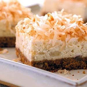3. Meanwhile, in a small bowl stir together the sour cream, creme de cacao, and rum. Spoon sour cream mixture over filling, spreading evenly; bake for 5 minutes more. (Sour cream layer may crack slightly). Cool in pan on a wire rack. Cover and chill for 4 to 24 hours. To serve, sprinkle with toasted coconut. Makes 20 servings.