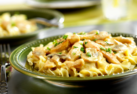 Add the soup and sour cream and heat to a boil. Return the chicken to the skillet and cook until the chicken is cooked through. Serve the chicken mixture over the noodles. Garnish with parsley, if desired.