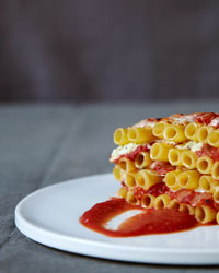 Put half of the cooked pasta into the prepared baking dish and top with about a third of the tomato sauce. Spread the ricotta mixture on the sauce in an even layer. Cover with the remaining pasta and then the remaining sauce. Top with the remaining 1/2 cup mozzarella and the remaining Parmesan. Drizzle with the remaining 1/2 tablespoon oil. Bake until bubbling, about 30 minutes. Let sit 10 minutes before cutting.
