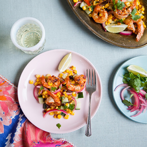 Using a serrated knife, cut the kernels from the ears over a large bowl. Toss the corn with the cucumbers, dates, cilantro, lime juice and the remaining 1 tablespoon of olive oil. Drain the pickled onion strips and add them to the salad. Season with salt and pepper and toss well. Transfer to a platter, top with the grilled shrimp, garnish with the pea shoots and serve.