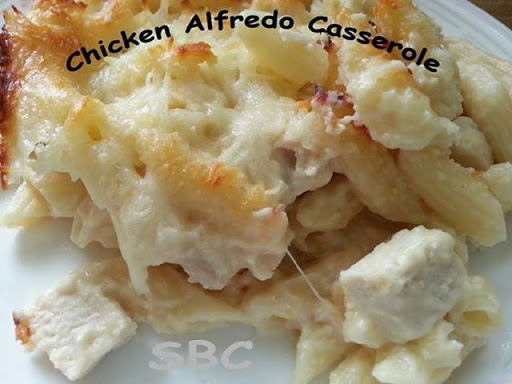 **In a bowl combine the pasta, Alfredo sauce, cooked chicken, chicken broth, garlic, salt and pepper, shredded Parmesan cheese and mix well