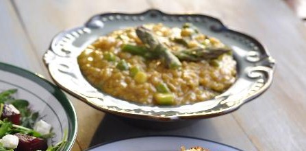 Add 1 cup stock to pot, cooking and stirring risotto until stock is completely absorbed. Add another cup of stock and repeat the process. After the fifth cup of stock, add asparagus. After the sixth cup, taste risotto. The rice should be firm but cooked through. If still firm, add the final cup of stock. If texture is correct, add the half-and-half, stirring until absorbed. Remove from heat, add Parmesan and season with salt and pepper.