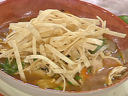 Season the soup, to taste, with salt and ladle the soup into wide soup bowls, with a handful of tortilla strips added to each bowl.