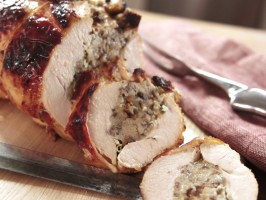 Lay the turkey breast skin-side down on a clean cutting board. Spread the stuffing over the center of the breast. Roll the breast around the stuffing and tie with butcher's twine at 1-inch intervals. Transfer to a foil-lined baking sheet and spray the entire breast with canola oil. Bake for 15 minutes, reduce the heat to 400 degrees F and continue baking until an instant read thermometer inserted into the stuffing registers 180 degrees F, about 1 hour.