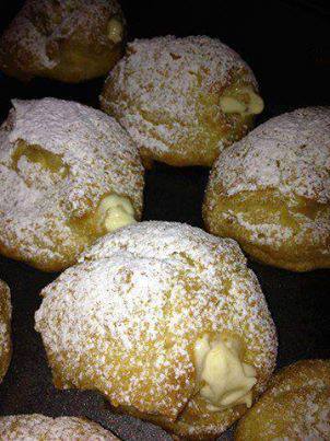 Over medium heat melt butter in water. Bring to a boil and remove from heat. Immediately add flour salt and sugar whip in with a wooden spoon. Add one egg at a time to incorporate well into dough. Drop by cookie scoop onto parchment paper on baking sheet. Bake at 425 degrees for 20 to 25 min. Cool on wire rack then fill with the custard mixture I posted earlier and dust with powdered sugar. Enjoy!!!!!