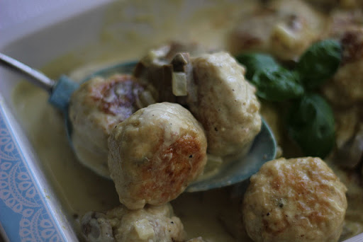 Combine the ground chicken, onion, egg, bread crumbs and salt & pepper in a mixing bowl. Roll into meatballs. Bake on lightly sprayed cookie sheet for 10-12 minutes (you don't want any pink but you also do not want to overcook). While the meatballs are cooking, make chicken gravy in small saucepan. Combine the can of Cream of Mushroom soup and seasoning packet, till bubbling. Pour gravy over meatballs or serve with mashed potatoes and drizzle gravy over both (1 serving of gravy is about 1/2 cup).