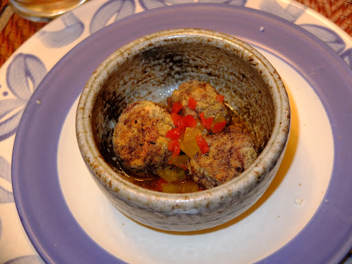 Red Bean Meatballs with Spicy Sauce. Meatballs are fragile, handle with care when frying. If going to use sauce as soup, cut back on olive oil. (Note: I would cut back a bit on the oil anyway.)