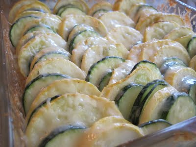 2. Slice the zucchini and squash into thin slices. Layer them into 4 rows across in the dish, over the onions. Slowly pour the olive oil over the pieces until they are evenly coated. Sprinkle with sea salt.