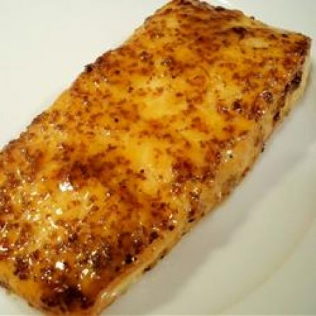 Season the salmon with salt and pepper and arrange onto the prepared broiler pan. Whisk together the brown sugar and Dijon mustard in a small bowl; spoon mixture evenly onto top of salmon fillets.
