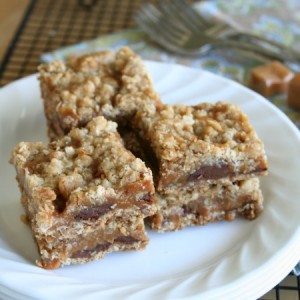 4.When crust is removed from the oven, immediately sprinkle with chocolate chips, spreading evenly. Pour melted caramel over chocolate chips. Top with remaining crust.