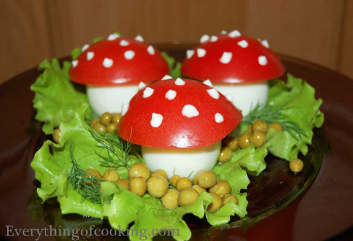 Put the lettuce leaves and dill springs onto a large plate to make it look like a grass. Put the eggs on the “grass” and cover with the tomato “caps”.