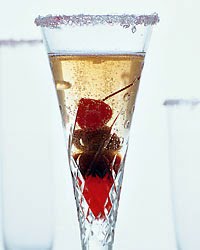 1. Moisten the outer rim of a flute with 1/2 ounce maraschino cherry syrup and coat with superfine sugar. Sprinkle the bitters over the sugar cubes. Add the Cherry Heering, maraschino cherries and the remaining 1/4 ounce of maraschino cherry syrup to the flute. Top with the Champagne and add the sugar cubes.