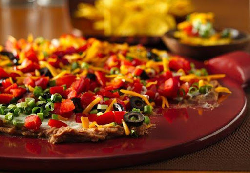 1.On flat 10- to 12-inch plate, spread refried beans. In small bowl, mix sour cream and dressing mix; spread over beans.