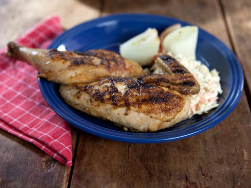Drain the chicken, pat dry and place the halves on the grill, skin side up. Baste with the sauce and cook for 30 minutes. Turn the chickens skin side down and baste the top with sauce. Continue to grill the chickens for an additional 30 minutes, turning and basting the chicken every 10 minutes. Check for doneness by twisting a drumstick; it should move easily.