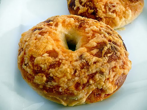 10. Remove the bagels from the refrigerator and gently drop them into the water, boiling only as many as comfortably fit (they should float within 10 seconds). After 1 minute flip them over and boil another minute. While the bagels are boiling, sprinkle the same parchment-lined sheet pans with cornmeal or semolina flour. Sprinkle the bagels with the shredded Asiago as soon as they come out of the water.