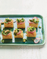 Cut the polenta into 16 pieces. Top with the radishes and arugula tapenade.