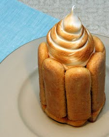 5.Remove charlottes from freezer; let stand for 5 minutes. Discard parchment paper. Carefully press up with your fingers from bottom of each charlotte to release. Dollop each charlotte with meringue. Using a small blowtorch, brown meringue; alternately, place under broiler and heat until golden. Transfer to serving plates; serve imme
