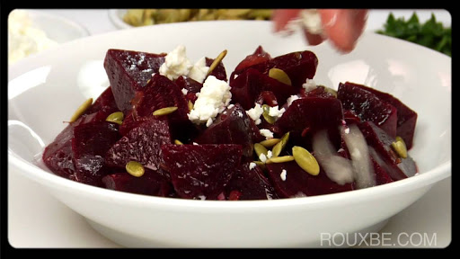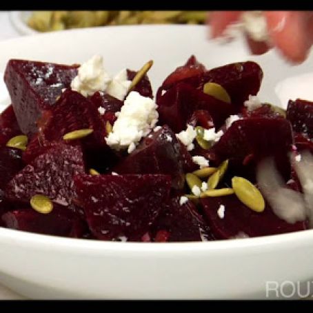 Tender and buttery steamed beets are tossed with a simple sherry vinaigrette and topped with pumpkin seeds and feta cheese.