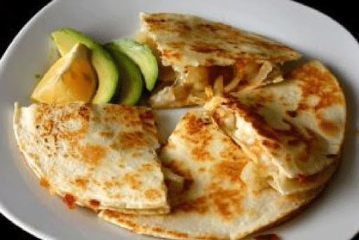 Top the tortillas with half of the cheese mixture; then add chicken or shrimp, and mango and top with the other half of the cheese mixture.