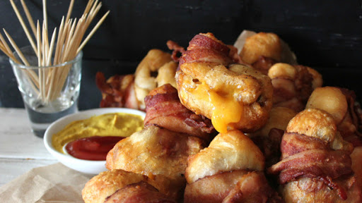 Wrap each stuffed “bomb” with half bacon slice; gently secure loose bacon with toothpick by inserting it through bacon and halfway into “bomb.”