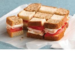 Spread wheat bread with cream cheese mixture, then top with turkey, tomatoes and white bread.