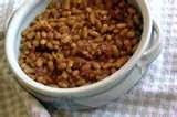 Cube half of bacon. Saute with onions. When bacon is crisp put in sugar, ketchup and vinegar. Bring to boil. Pour over beans. Place remaining bacon strips over beans and bake for 1 hour at 350 degrees.