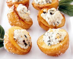 4. Turn on the broiler. Heat remaining ½ tbsp (7 mL) olive oil in a small nonstick skillet. Add garlic slices and fry until golden and crisp, about 1 to 2 minutes. Transfer to a medium stainless-steel bowl. Add the goat cheese, thyme and black pepper. Stir to combine. With a teaspoon, divide goat cheese mixture among potato cups. Broil potatoes for about 1 minute or until bubbling. Serve potato cups garnished with basil leaves.